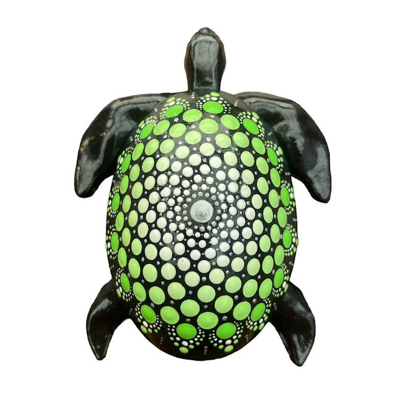 Hand cast and hand painted, the Lime Green Turtle is a unique addition to any space. Made with resin and finished with a striking mandala design, it adds a touch of color and whimsy to your decor. Packaged in a gift box with descriptive cards, this turtle is ready to bring joy and charm to your home.