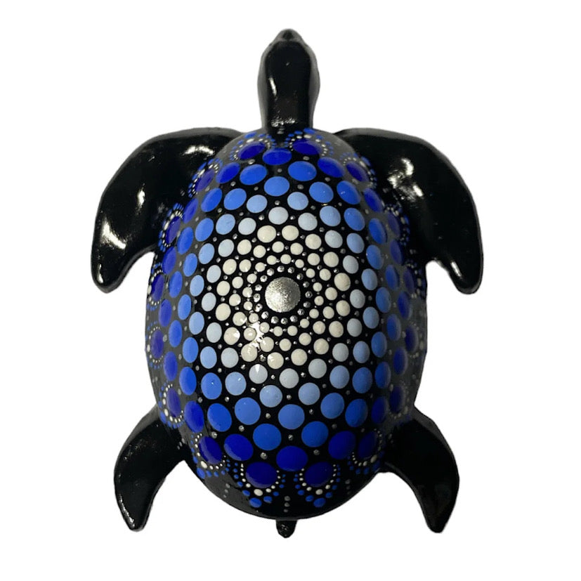 Hand cast and hand painted, the Royal Blue Turtle is a unique addition to any space. Made with resin and finished with a striking mandala design, it adds a touch of color and whimsy to your decor. Packaged in a gift box with descriptive cards, this turtle is ready to bring joy and charm to your home.