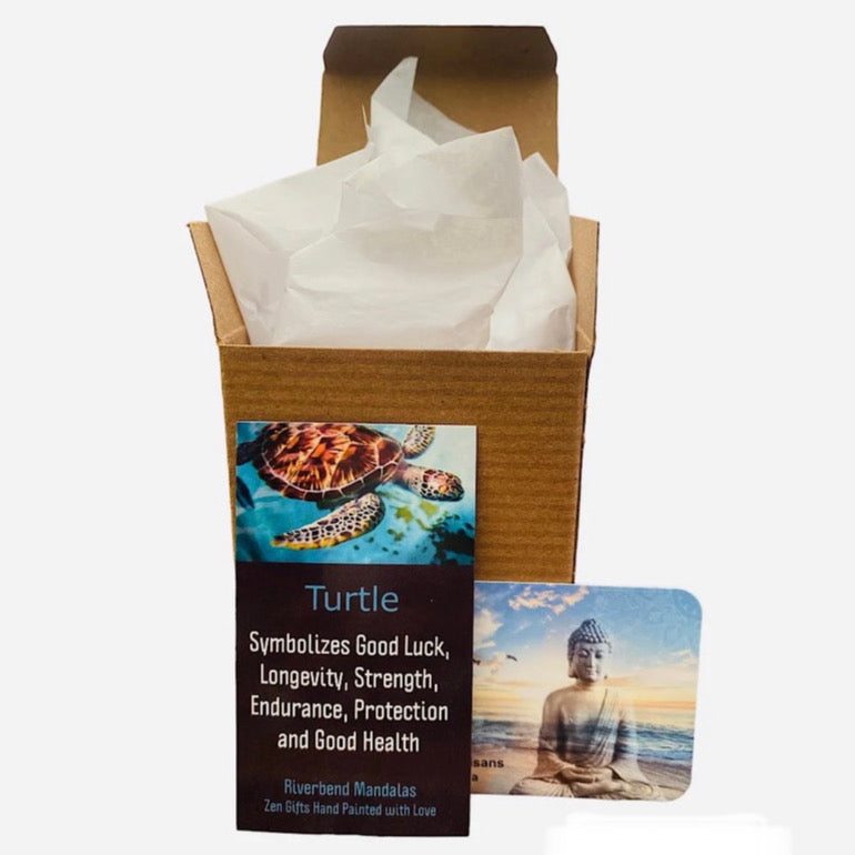 Hand cast and hand painted, the Turquoise Turtle is a unique addition to any space. Made with resin and finished with a striking mandala design, it adds a touch of color and whimsy to your decor. Packaged in a gift box with descriptive cards, this turtle is ready to bring joy and charm to your home.